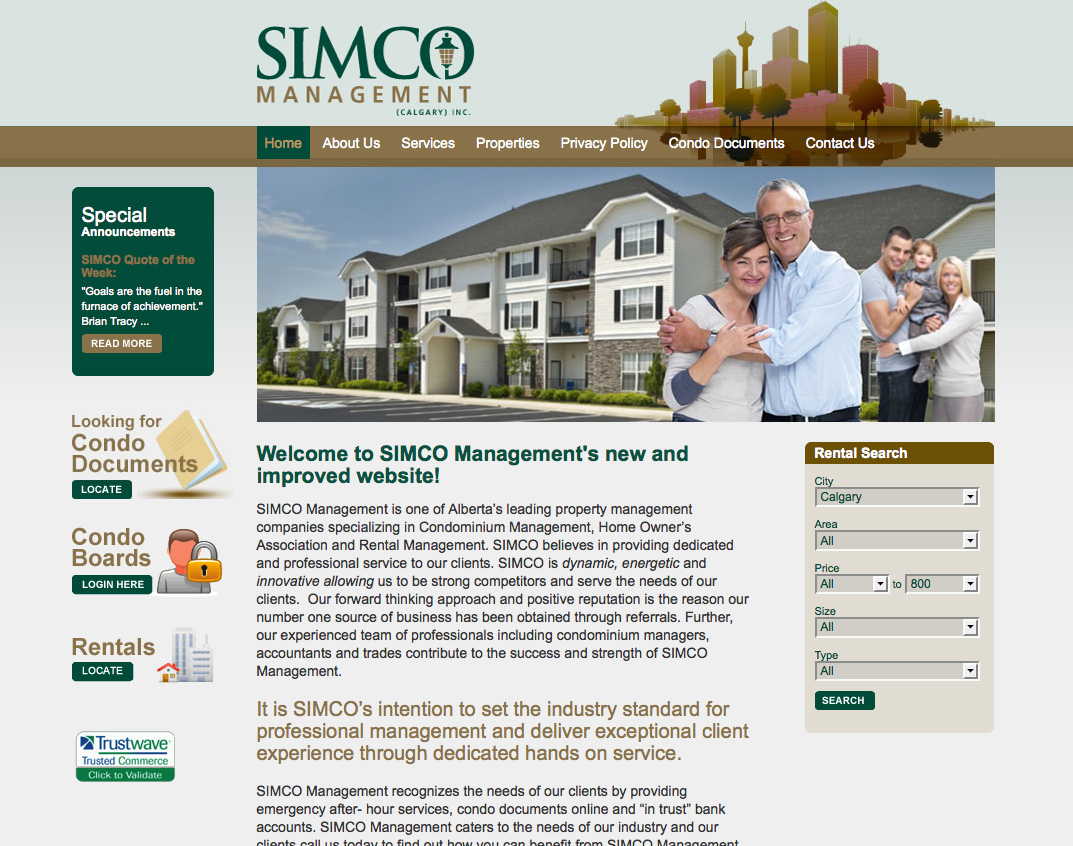 Simco Management is a condominium management company as well as a house and unit rental company. The idea for the website was too give a feeling of warmth and professionalism using imagery of people and other elements that made you feel good about hiring this company. A full range of backend development was created from scratch.